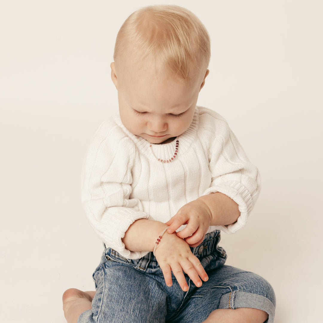 A little sparkle made just for them. This dainty bracelet pairs soft shimmer with a touch of pink tourmaline — the stone of love and joy. Lightweight and comfortable for everyday play, while also matching with Mama.